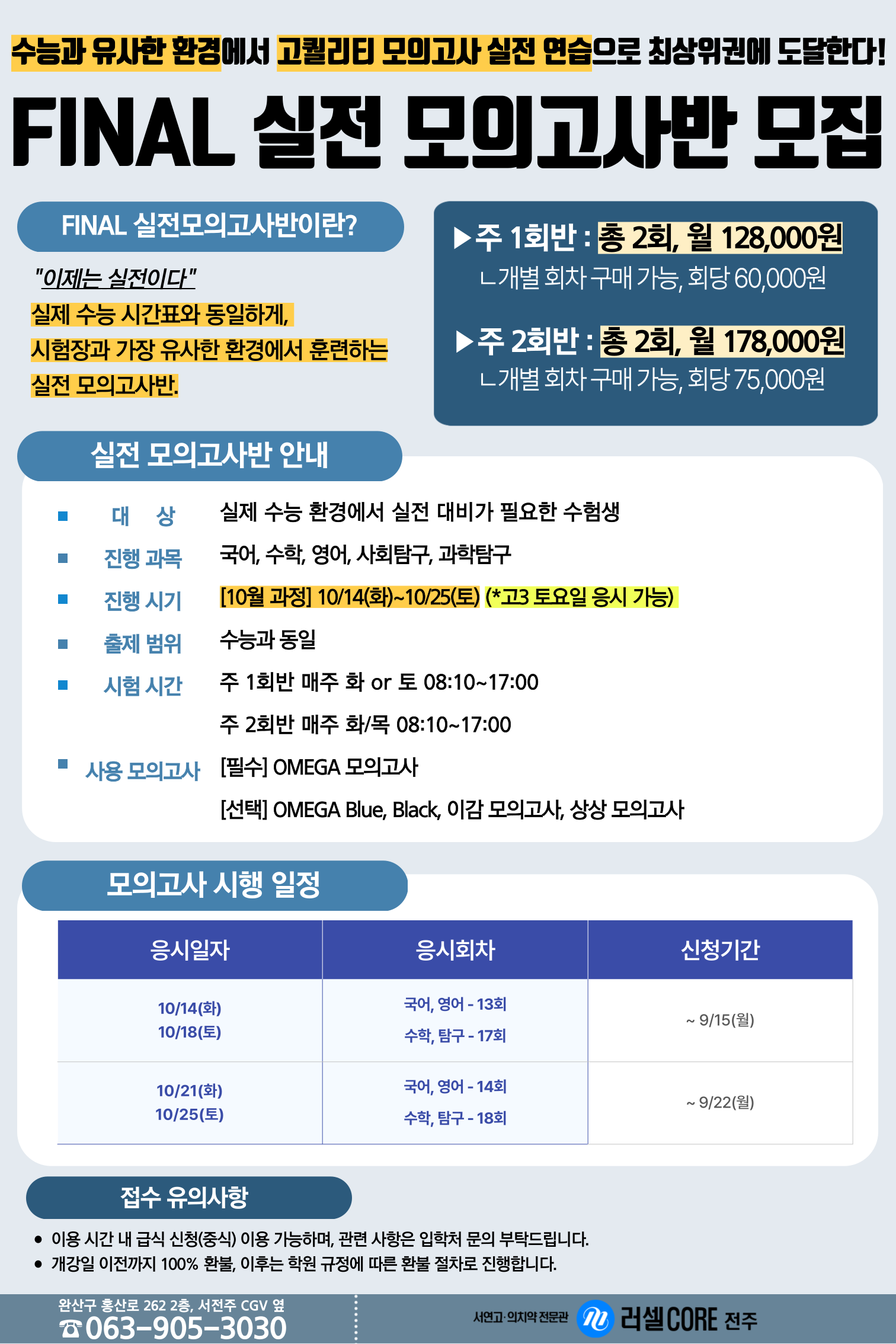 [°øÁö] FINAL ½ÇÀü ¸ðÀǰí»ç¹Ý ¡Ú10¿ù °úÁ¤¡Ú Á¢¼ö ¾È³» | |||